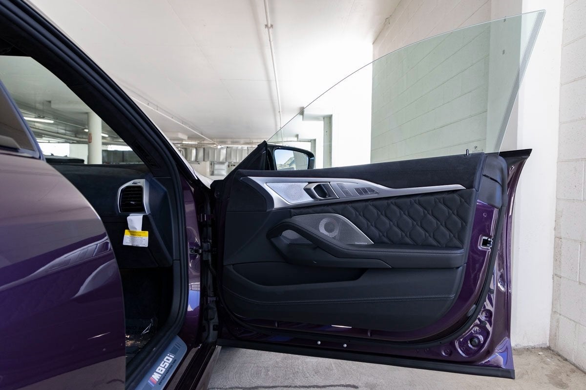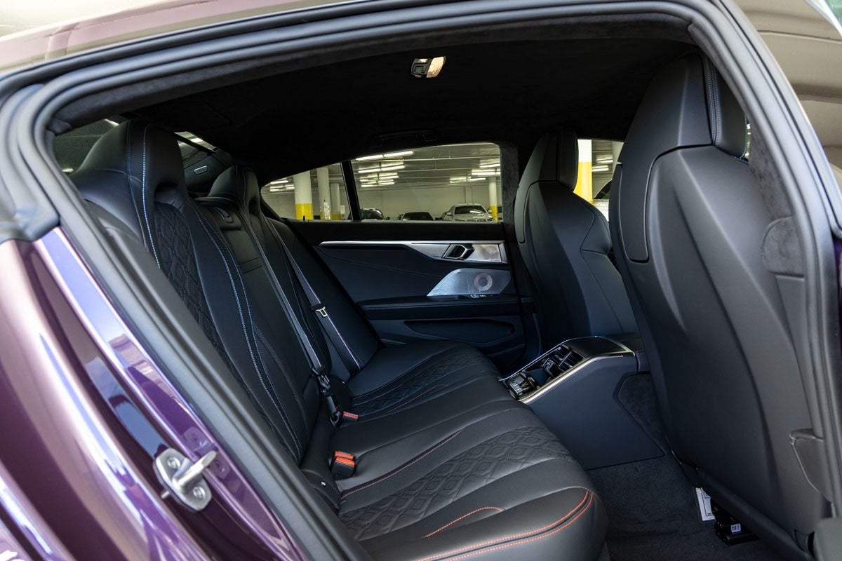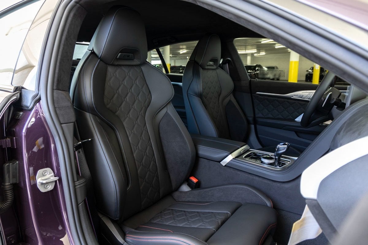 The exterior makes a dramatic statement with its exclusive Daytona Violet finish, M Carbon Roof, Extended Shadowline Trim, M Shadowline Lights, and powerful stance. M Sport Professional and M Performance Packages enhance both aesthetics and capability, complemented by M Sport Brakes with Black Calipers. A Power Moonroof and sleek body-color design elements maintain the elegant yet aggressive silhouette that defines the 8 Series Gran Coupe.