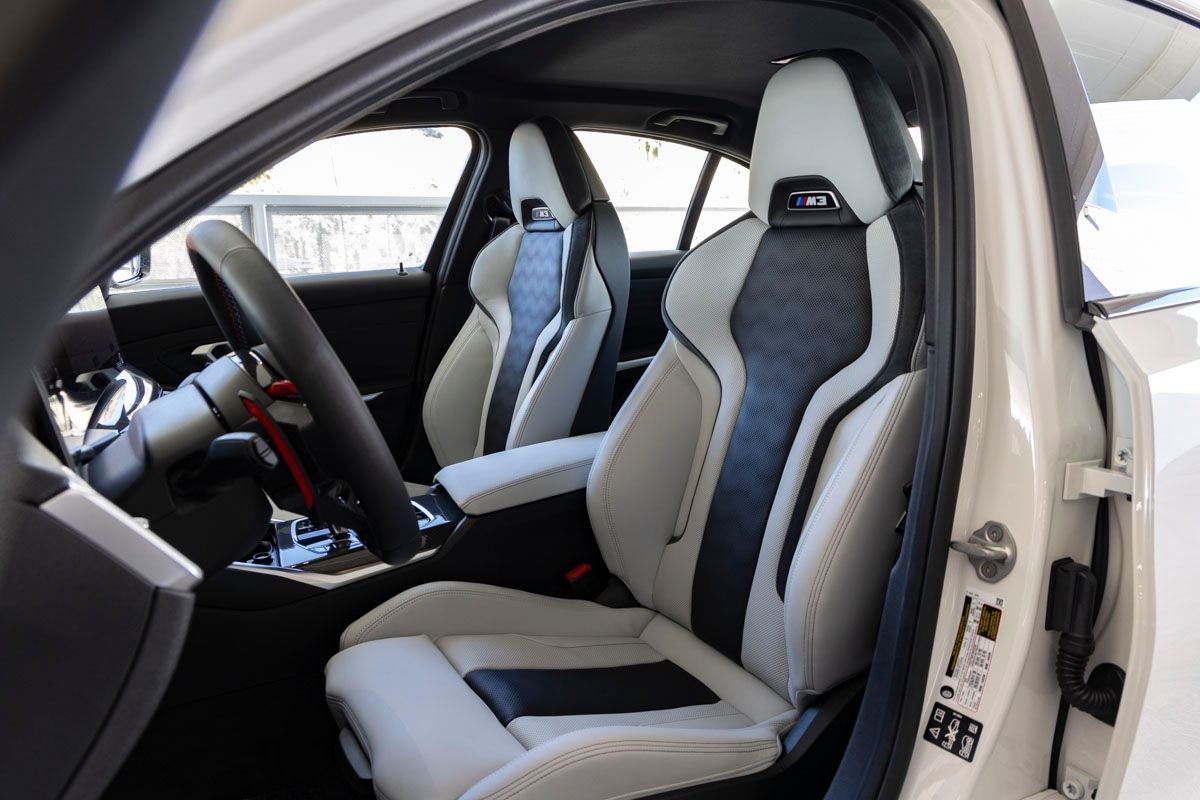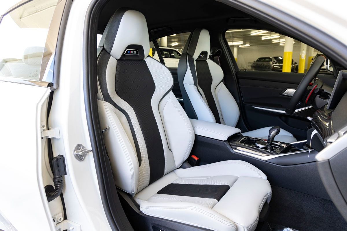 The M3 Competition stands as an icon of high-performance design, its Alpine White exterior delivering a clean yet aggressive aesthetic that highlights its muscular proportions. Enhanced by signature M styling, Full LED Headlights with Cornering Lights, and staggered 19-inch front and 20-inch rear Forged Silver wheels, this sedan commands attention from every angle. Its aerodynamic elements and performance-focused design language reinforce its track-inspired DNA.