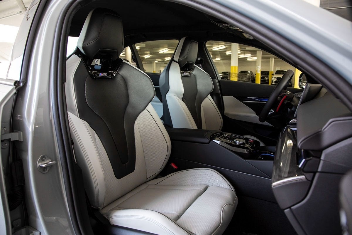 The M5 Base asserts its presence with the Brooklyn Gray Metallic exteriorsleek, modern, and unmistakably powerful. Enhancing this aggressive stance is the M Carbon Exterior Package, along with the distinctive BMW Iconic Glow Kidney Grille. The Carbon Fiber Reinforced Polymer Roof and M Compound Brakes with Red Calipers further emphasize its performance-focused design, while body-color bumpers and Mirror Caps complete its confident aesthetic.