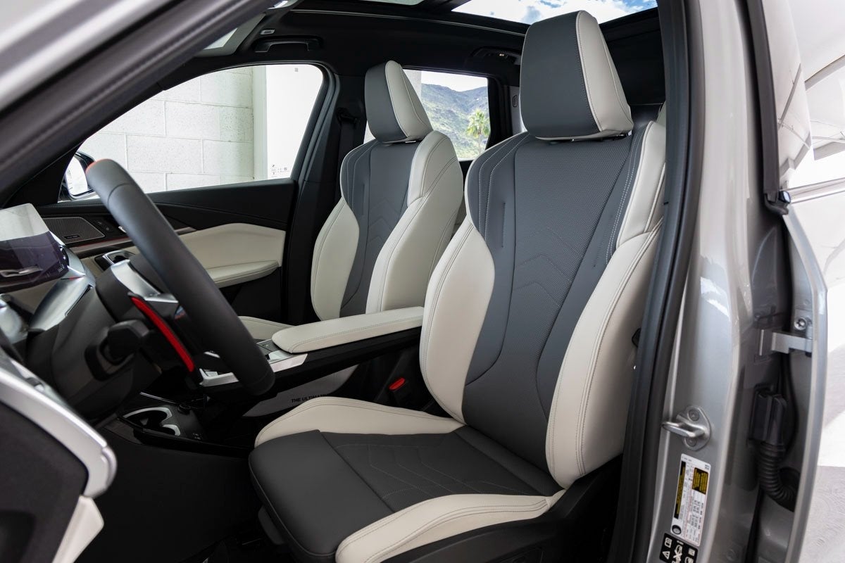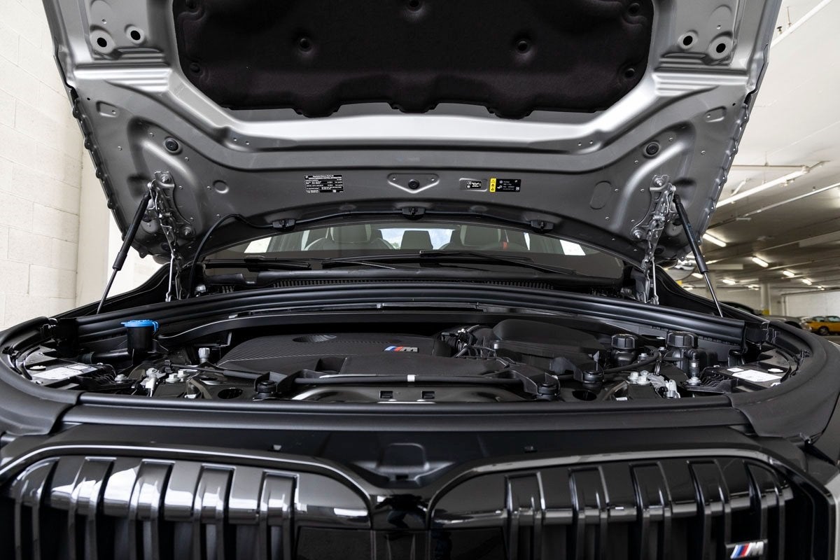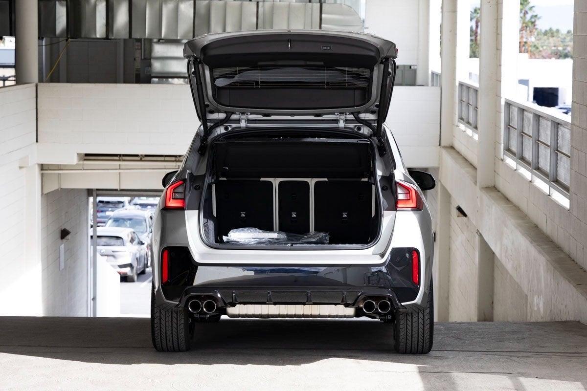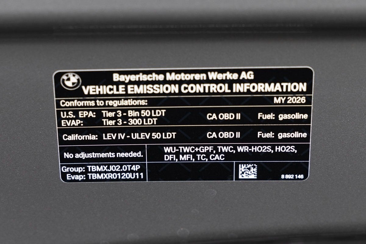Comfort and convenience amenities include automatic temperature control with front dual zone A/C, rear window defroster, Head-Up Display, memory seat, power driver and passenger seats with lumbar support, remote engine start, remote keyless entry, steering wheel-mounted audio controls, power windows and steering, and a power liftgate. The cabin also offers an auto-dimming rear-view mirror, compass, heated steering wheel, illuminated entry, leather sport steering wheel, M Alcantara/Veganza Upholstery, universal garage-door opener, and front bucket sport seats with heating functionality.