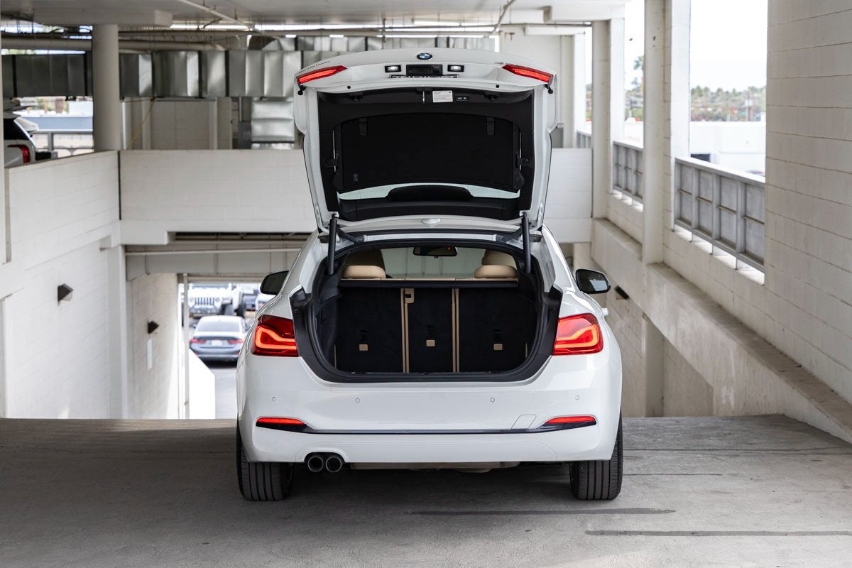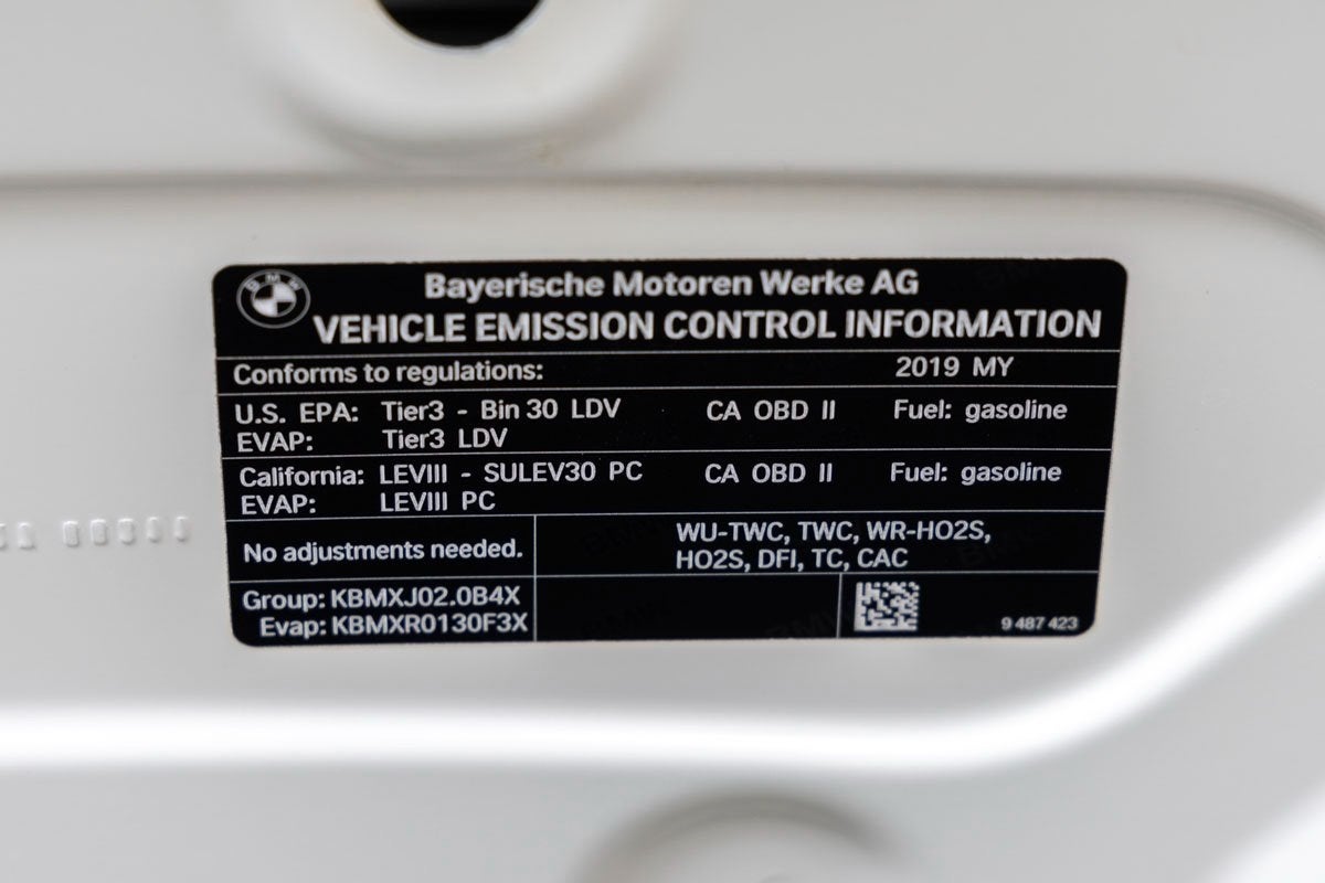 Technology is highlighted by the Navigation System, HandsFree Bluetooth® & USB Audio Connection, HD Radio, HiFi Sound System with 9 speakers, SiriusXM Satellite Radio, Apple CarPlay compatibility, and a detailed trip computer. Safety and driver assistance systems include Active Blind Spot Detection, Exterior Parking Camera Rear, ABS brakes, traction control, electronic stability control, emergency communication system (BMW Assist eCall), antiwhiplash head restraints, knee airbag, and multiple occupant airbags.