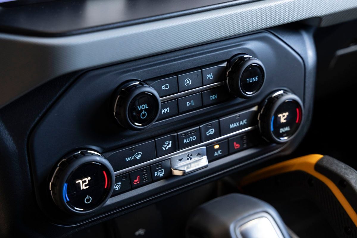 The exterior features bold styling and functional off-road equipment including the Ford Performance Heavy-Duty Modular Front Bumper, Alloy Wheels, and Dual Tops for versatile open-air driving. High ground clearance and rugged body design give the Bronco its unmistakable adventure-ready look.